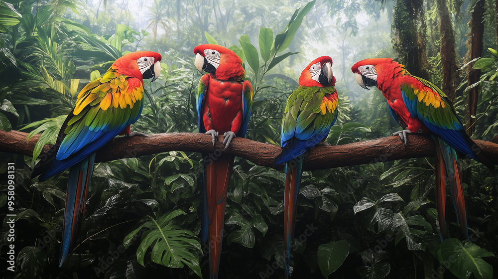Do Przedszkola - Tropikalny las deszczowy z mnóstwem papug w różnych odcieniach, które swobodnie latają w gęstej... #958098131