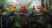 • Tropikalny las deszczowy z mnóstwem papug w różnych odcieniach, które swobodnie latają w gęstej roślinności.