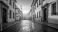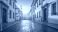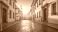 • Cobblestone Street in European Town at Sunrise Empty Road Through Historic Buildings Urban Scene Old Town Architecture Travel Destination Morning Light Tranquil Streetscape