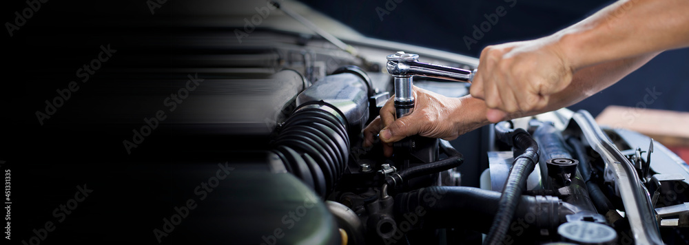 Naklejki Auto - Car mechanic working on car engine, car maintenance concept. #451331335