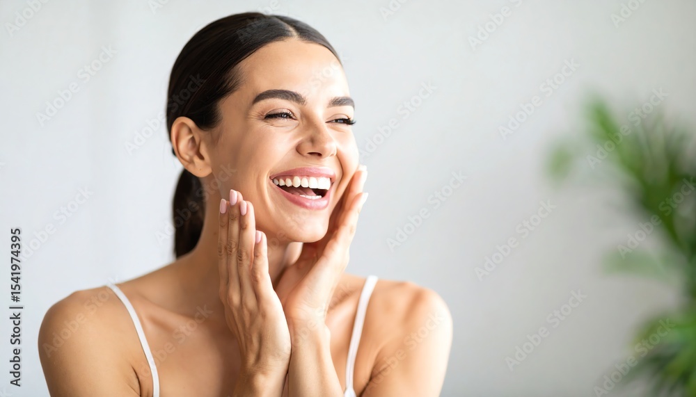 Naklejki Beauty - Beautiful woman smiling and laughing with joyful energy while touching her skin in a bright and... #1541974395