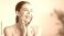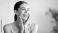• Beautiful woman smiling and laughing with joyful energy while touching her skin in a bright and positive atmosphere