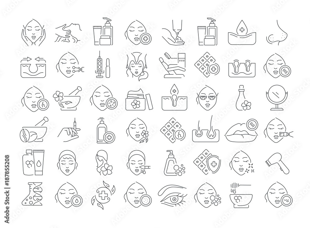 Naklejki Beauty - Vector graphic set. Icons in flat, contour, thin and linear design. Cosmetology. Skin care.... #187855208