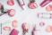 • Flat lay frame of flowers and cosmetics products with Rose essential oil: toner,serum, essence,moisturizer and others on white desktop background, top view, banner. Facial Skin care beauty