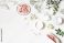 • Styled beauty corner, web banner. Skin cream, tonicum bottle, dry flowers, leaves, rose and Himalayan salt. White table background. Organic cosmetics, spa concept. Empty space, flat lay, top view.