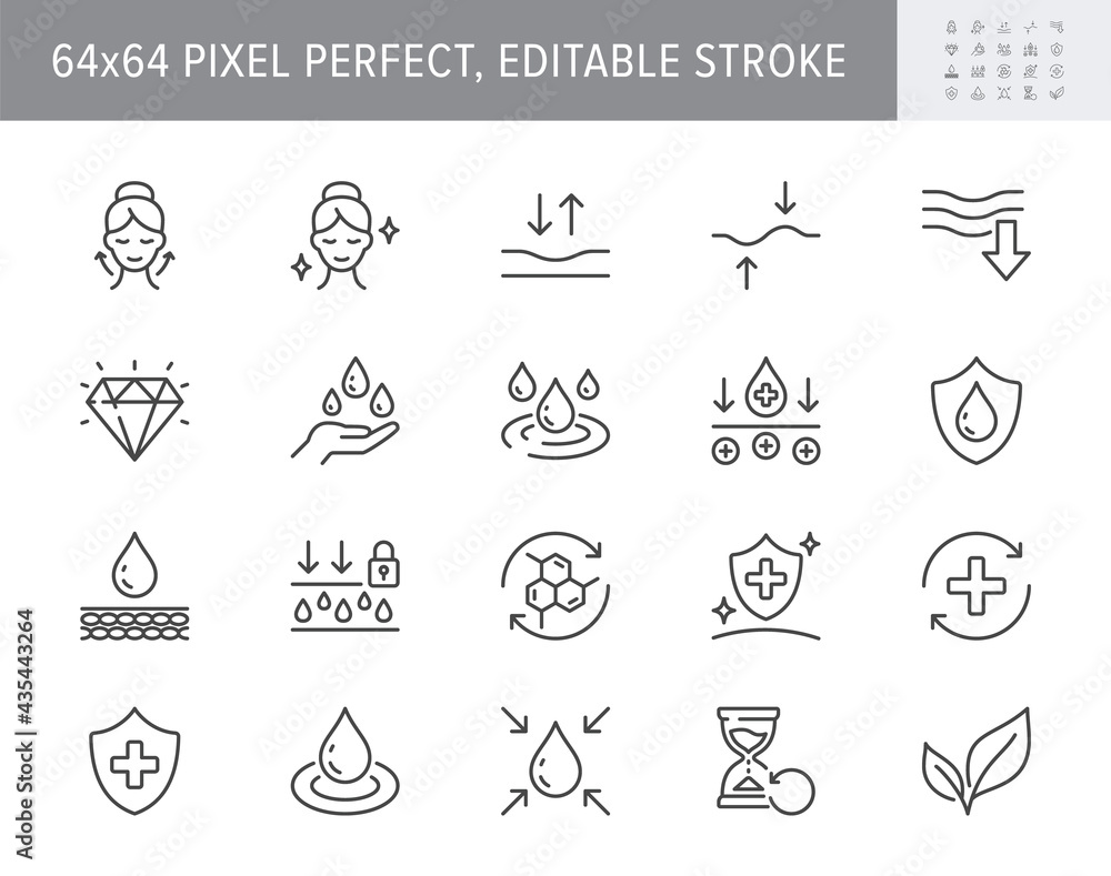 • Cosmetic properties line icons. Vector illustration include icon - shield, face lifting, collagen, dermatology, serum outline pictogram for skincare product. 64x64 Pixel Perfect, Editable Stroke