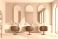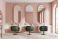 • Pink cozy beauty salon with chairs in row and mirror, panoramic window