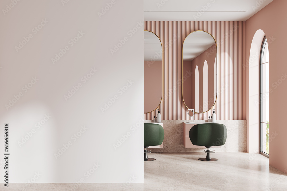 • Pink beauty salon with chairs in row and mirror, panoramic window. Mockup wall