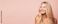 • Smiling young woman with blonde long groomed hair isolated on pastel flat background with copy space. Blonde hair care products banner template, hair salon.
