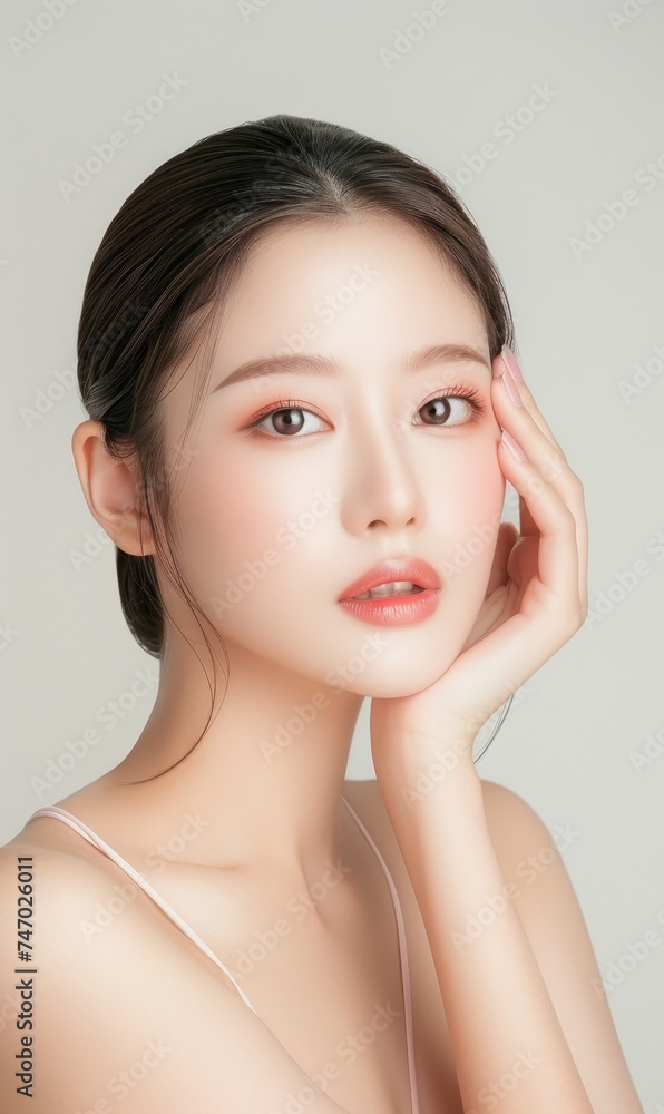 Naklejki Beauty - Close up beauty portrait of a laughing beautiful japanese woman applying face cream and looking... #747026011
