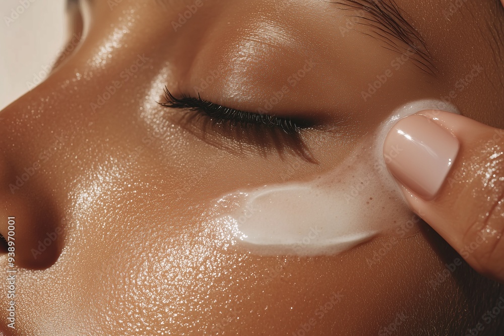 Naklejki Beauty - face and hand applying cream on cheek, highlighting the facial skin tone, skin care, the use of... #938970001