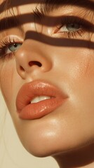 Naklejka A stunning woman with flawless skin, her facial features glowing softly in natural light, embodying timeless beautyDopasuj i kup
