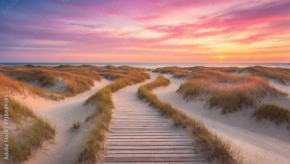 • Malowniczy zachód słońca nad ścieżką przez wydmy plażowe