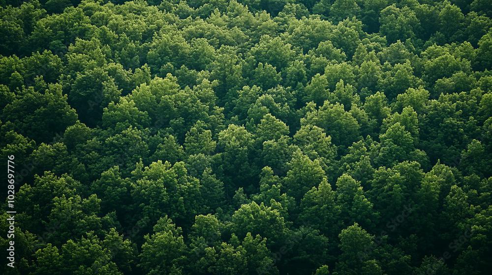Naklejki Góry - Widok z góry ukazuje młody, bujny las, w którym drzewa pokryte są świeżymi, zielonymi liśćmi. #1028697776