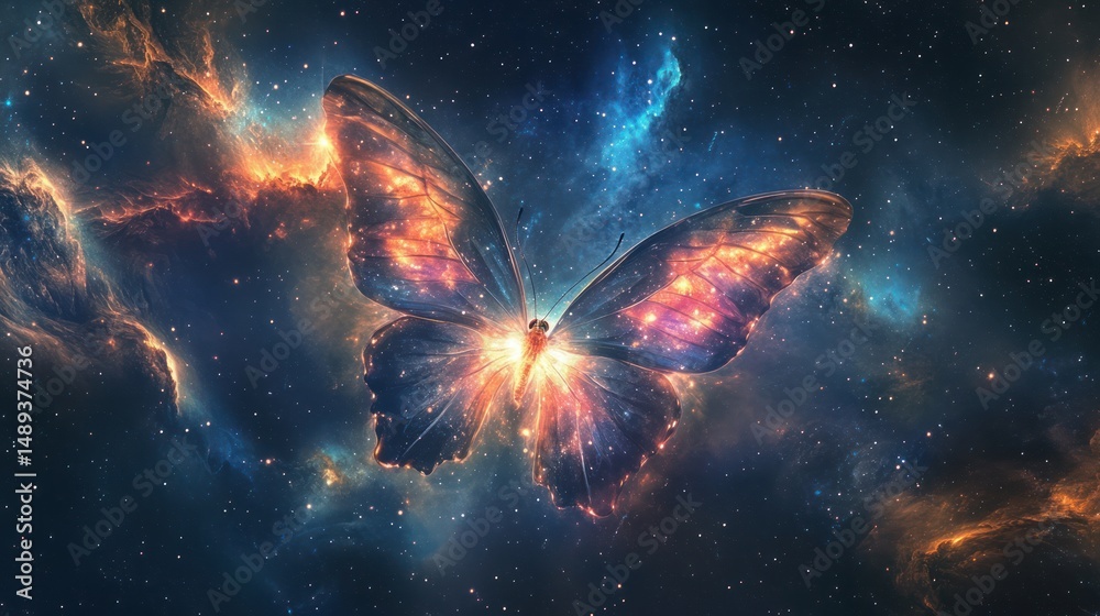 • Cosmic lepidopteran soaring through nebula with a radiant glow effect