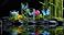 • Un cadre spa serein avec bambous, bougies et pierres noires à la surface de l'eau, de la mousse verte, des papillons bleus et des fleurs exotiques créant une atmosphère de détente et de bien-être.