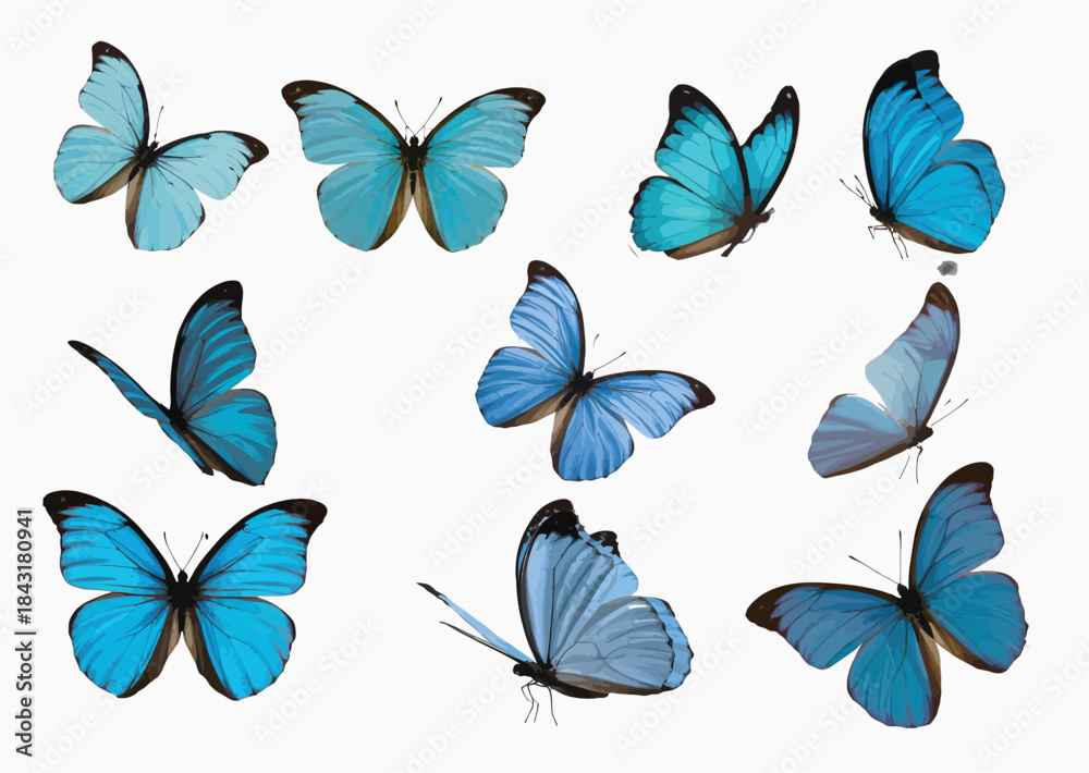 • set of blue butterflies in detailed vector illustration style, isolated on clean background, showcasing lepidoptera insects and morpho amathonte beauty, ideal for botanical themes, prints, and digital