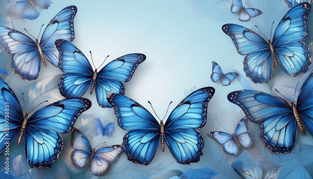 Naklejki Motyl - blue morpho butterflies on a light blue background #1899758857