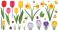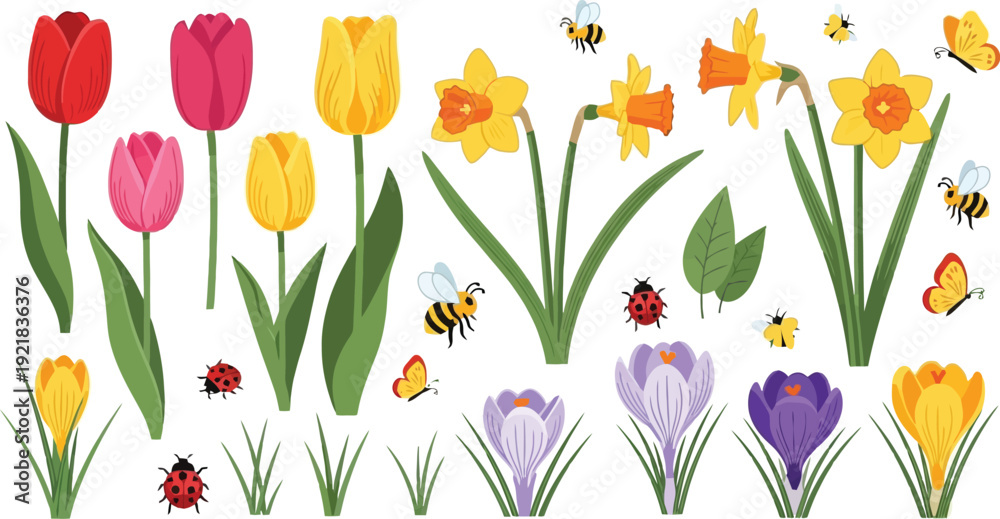 • Spring flowers tulips daffodils crocuses ladybugs bees and butterflies isolated on transparent background