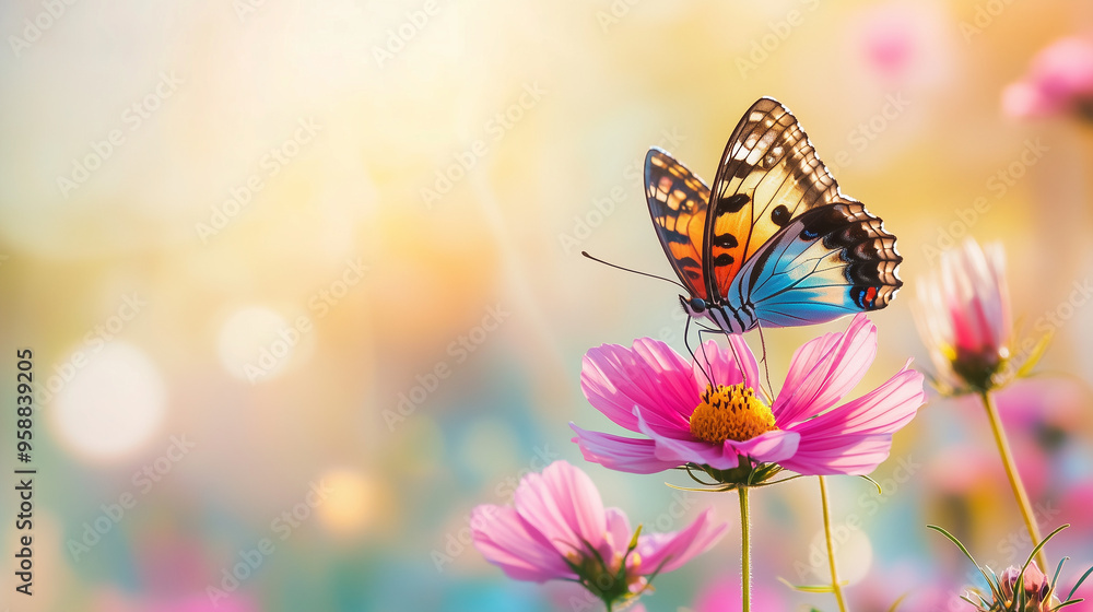 Naklejki Motyl - W malowniczym polu pełnym kolorowych kwiatów kosmosu, motyl spoczywa na jednym z płatków, kąpiąc... #958839205