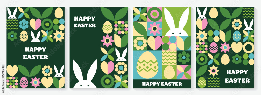 Geometria - Set of geometric Easter greeting card. Abstract background with bunny, egg and flower. Vector... #1279457423