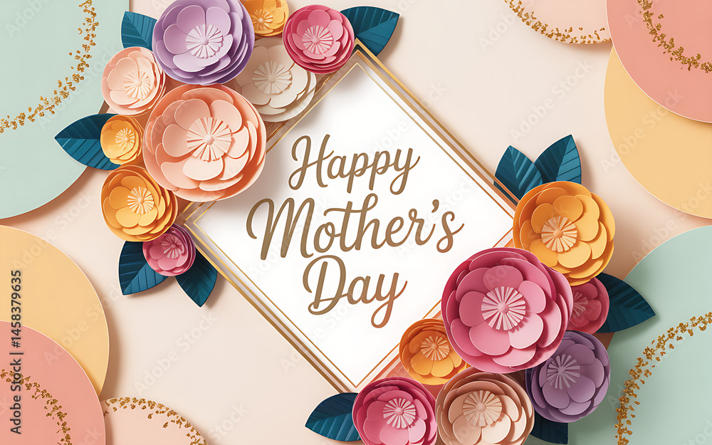 Geometria - Elegant floral Mother’s Day greeting card with colorful paper flowers and gold frame on pastel... #1458379635
