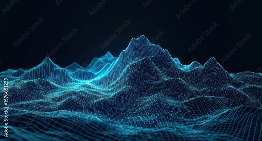 Geometria - Glowing blue digital wireframe mountain range with peaks and valleys on a dark background,... #1576651233