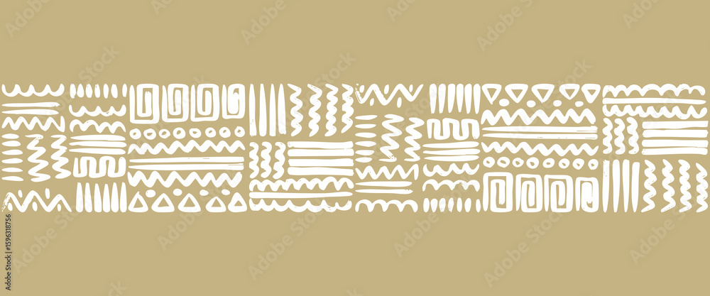 • Hand drawn tribal geometric pattern with white symbols on a brownish earth tone background. This ethnic style design features abstract lines, zigzags, triangles, and dots.