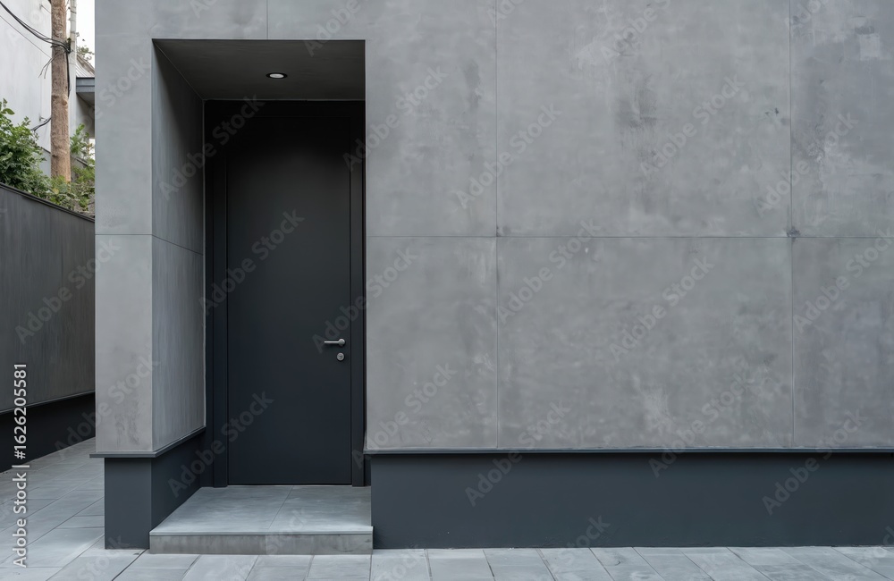 Geometria - Modern grey building facade with dark grey side entrance door. Architecture features clean lines,... #1626205581