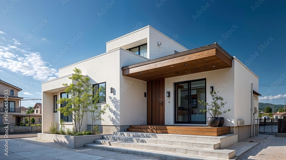 Geometria - Maison moderne avec façade blanche et détails en bois sous ciel bleu #1645458233