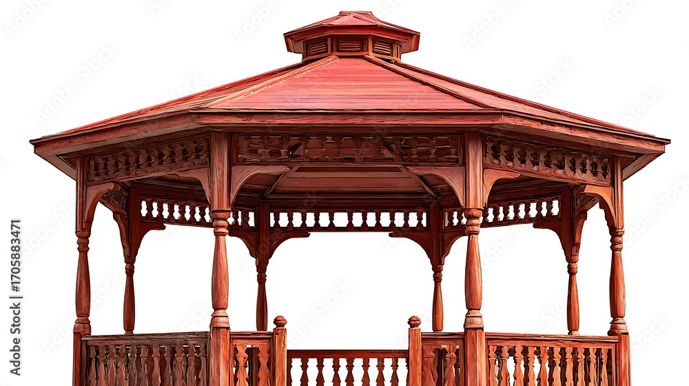 • Ornate Reddish Brown Gazebo with Intricate Carvings on Background