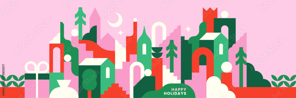 Geometria - Happy Holidays pink Christmas banner with festive geometric design #1710850577