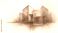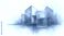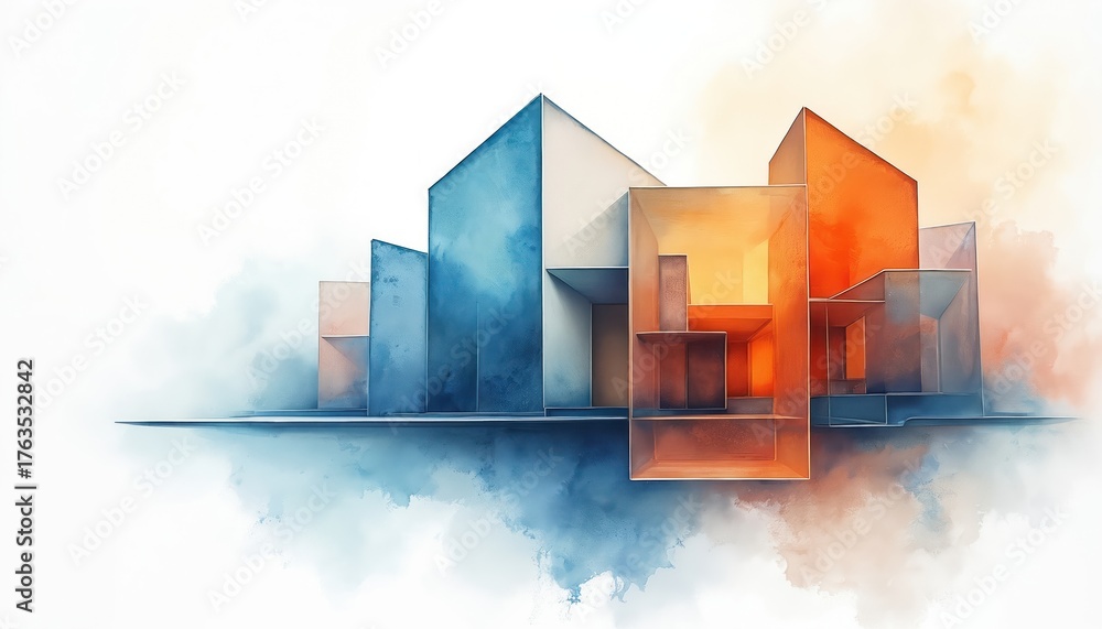 • Abstract geometric structures form a modern city skyline. Buildings in blue and orange hues appear to float on clouds. Clean lines and soft watercolor textures define the architectural concept art.