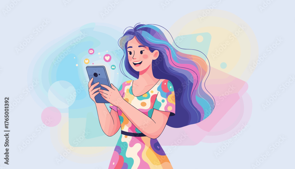 Geometria - Vibrant young woman with colorful hair joyfully using a smartphone, surrounded by social media... #1765001392