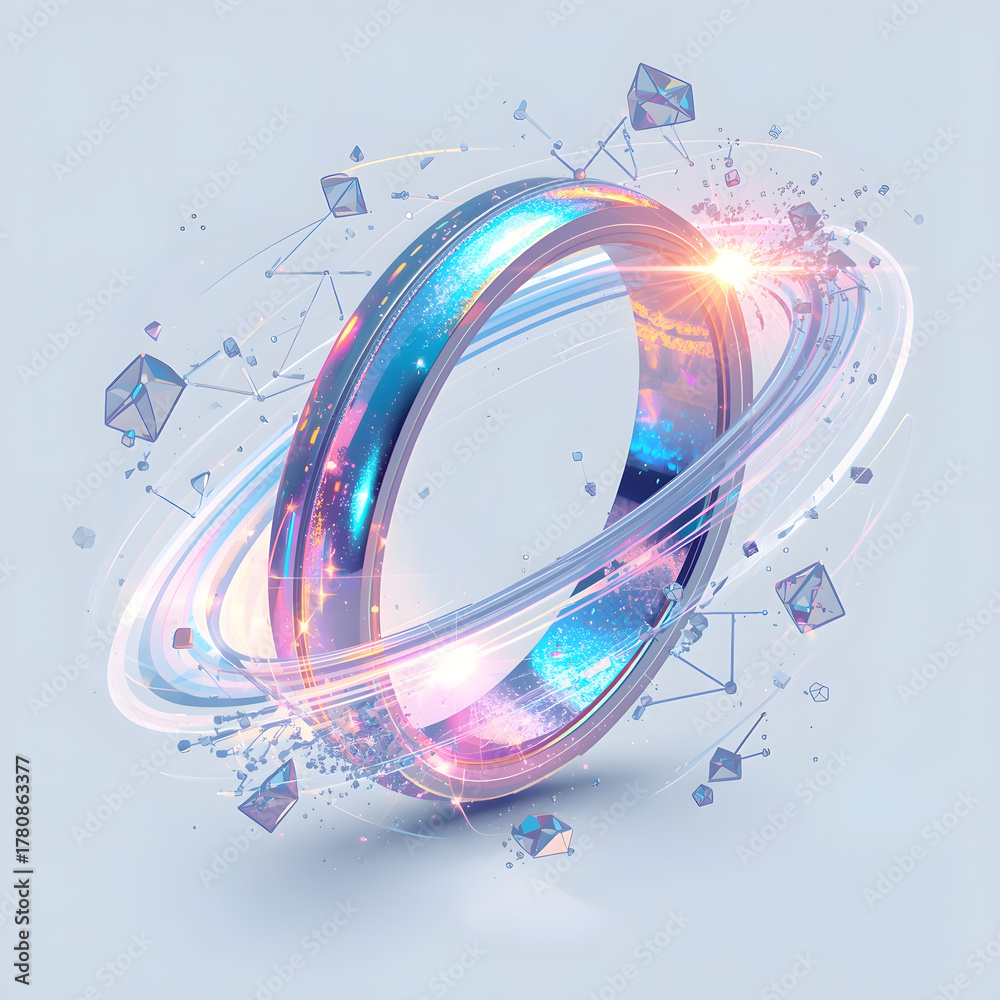 • Vector illustration of a holographic ring with geometric particles orbiting, futuristic aesthetic