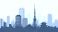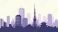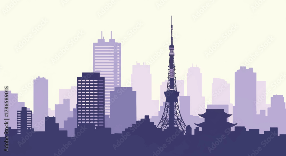 • Flat vector skyline of Tokyo featuring modern skyscrapers and slim tower silhouette. Solid colors, clean geometric shapes, no gradients. Ideal for travel concepts and digital editorial use