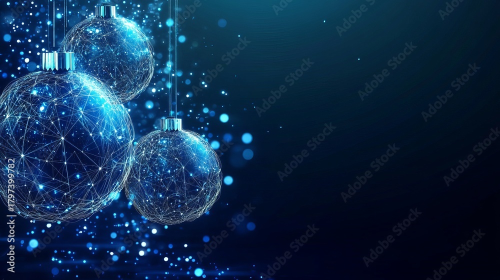 • Dazzling blue Christmas ornaments with intricate geometric patterns shimmer against a dark, bokeh-filled background, evoking a modern holiday celebration.