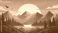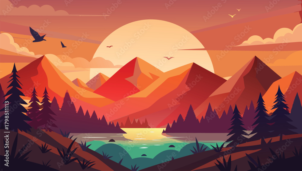 • Stunning geometric mountain landscape at sunset with vibrant colors and tranquil lake, evoking adventure and serenity
