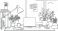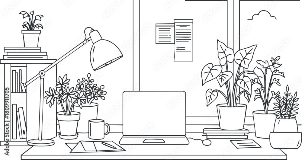 • Minimalist line art illustration of a modern home office workspace featuring plants, a desk lamp, and a laptop