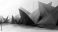 • A striking abstract sculpture composed of sharp, angular geometric shapes in red and dark gray, set against a minimalist, bright background with delicate wire e
