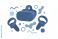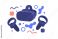 • Modern virtual reality headset and controllers surrounded by abstract geometric shapes and fluid elements