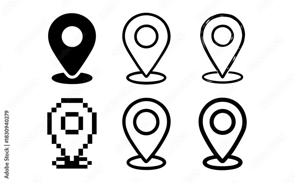 • Diverse map pin icons in black and white with various graphic styles