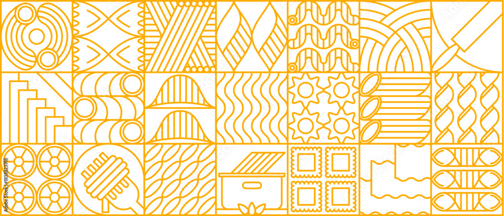 • Noodle pasta modern geometric pattern with line vector ornament showing Italian food shapes, pasta forms, noodles and cooking elements arranged in yellow linear grid. Vintage retro linear background