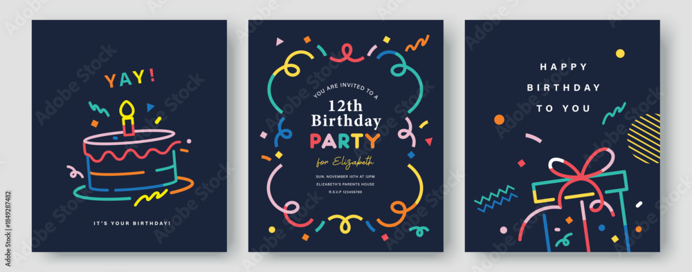 • Set of Happy Birthday greeting card, invitation card, poster, cover, vector illustration with birthday cake, confetti and gift box in colorful minimalist lines.
