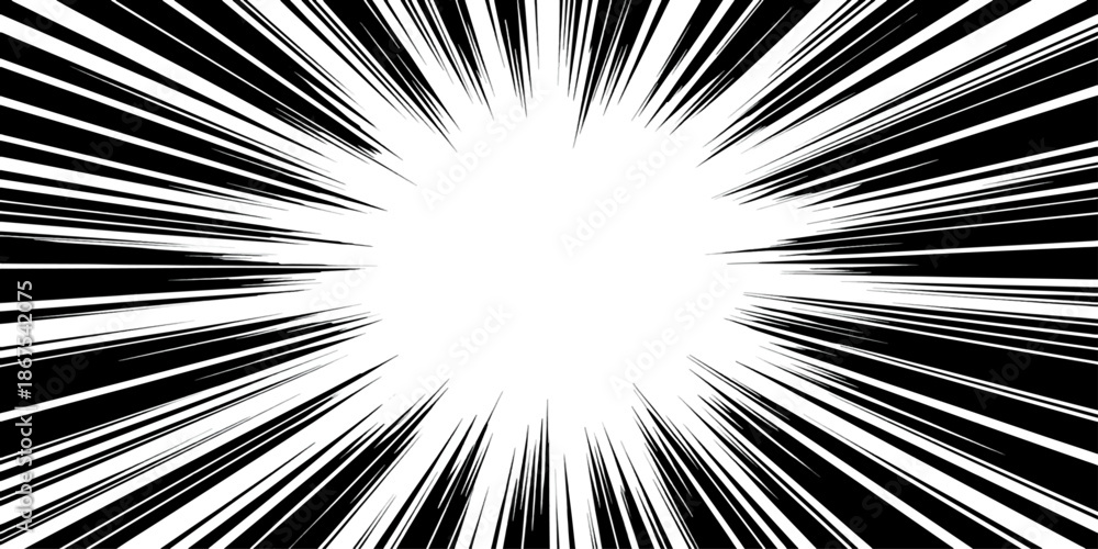 • A black and white abstract background features a starburst pattern of light rays and energy beams creating a motion texture with a fractal art explosion design
