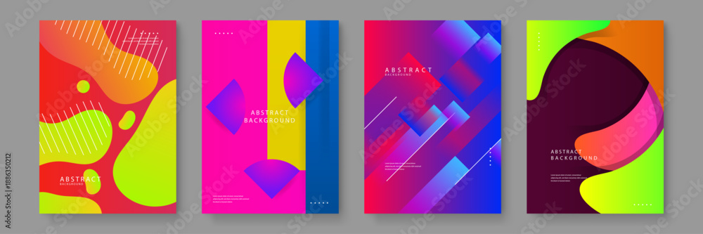 • Dynamic poster design set with a mix of geometric blocks and fluid liquid shapes in high contrast neon colors