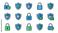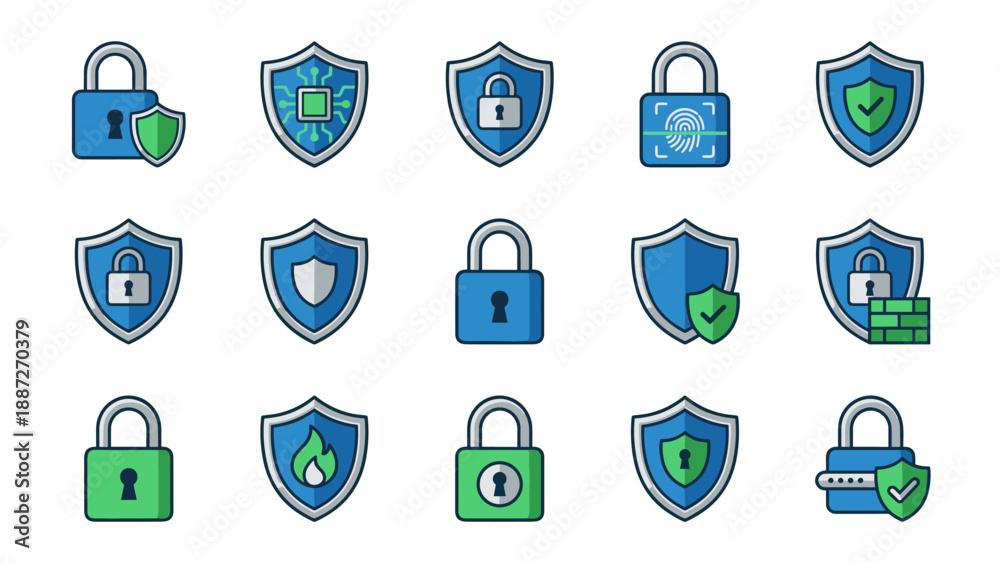 • Cybersecurity and Data Protection Icon Set Featuring Blue and Green Padlocks and Shields in a Clean Geometric Style for Network Security, Privacy, Encryption, and Digital Safety Concepts.