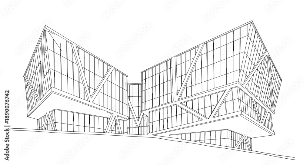 Geometria - Modern architectural complex with geometric structures and glass facades in line art #1890076742