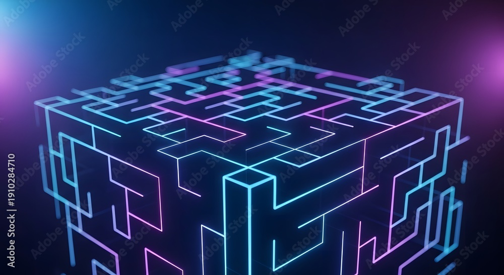 Geometria - Abstract maze cube with glowing lines and neon light represents complex problem solving and... #1910284710