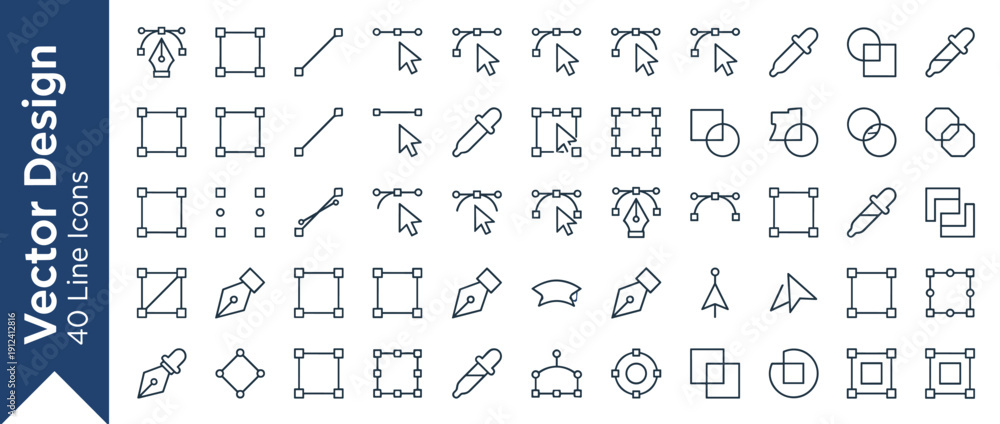 • Vector Design Line Icon Set of 40 Graphic Design Tools Including Pen Tool, Anchor Points, Nodes, Selection Cursors, Eyedropper, and Geometric Shapes for UI UX Web Development and Digital Art Software